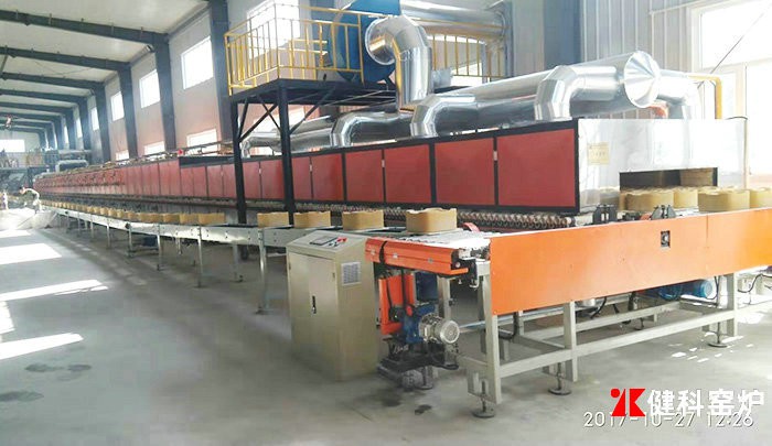 輥道窯的燃燒室在輥?zhàn)拥南路?,用壓縮空氣霧化重油、柴油、煤油等燃料進(jìn)行燃燒。也有用煤氣發(fā)生爐所產(chǎn)煤氣進(jìn)行燃燒的,比較大型的陶瓷廠大都采用雙段冷煤氣站,使用冷靜煤氣進(jìn)行燃燒,產(chǎn)生高溫。燃燒室與輥道之間,有耐火材料隔離,火焰不直接接觸被燒制的產(chǎn)品。相對(duì)來(lái)說(shuō),煤氣發(fā)生爐配套輥道窯燃燒比重油、柴油等成本低,比直接燃煤效率高環(huán)保達(dá)標(biāo)。使用重油為燃料時(shí),為防止煙氣污染制品,要采取隔焰或半隔焰形式。電熱時(shí),為保護(hù)發(fā)熱體或使溫度更均勻,也需將發(fā)熱體和制品隔開(kāi)。